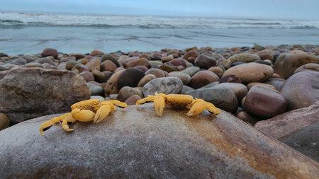Yellow crabs sunbathing on rocks on marine beaches