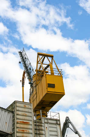 An old yellow freight crane stands against a bright blue sky.