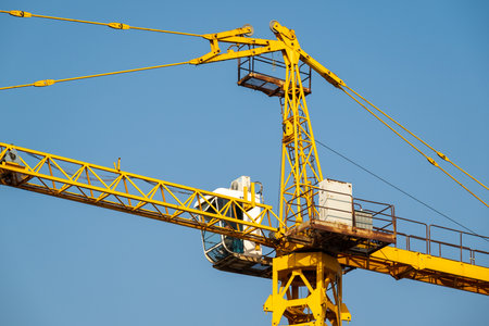 Yellow heavy duty industrial tower construction crane against blue sky with copy space