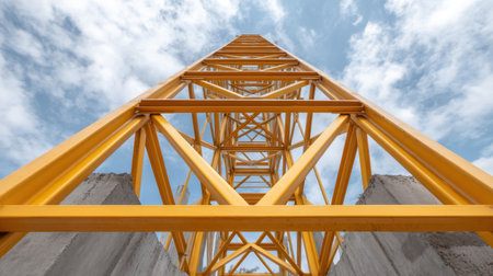 A striking view of a tall yellow construction crane reaching toward a bright blue sky filled with white clouds, showcasing the intricate design and strength of industrial machinery.