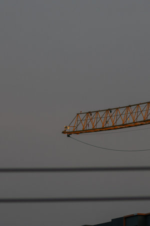 Conceptual image of Yellow, orange crane on construction site against color reduced grey silver sky background, copy space.