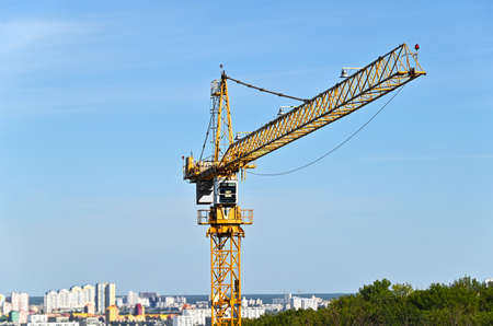 Yellow tall building crane on the construction site. Blue sky.