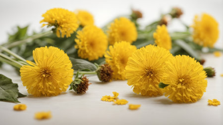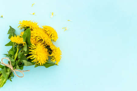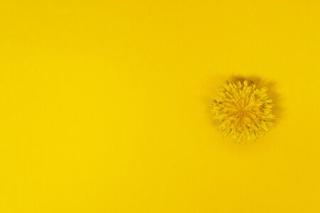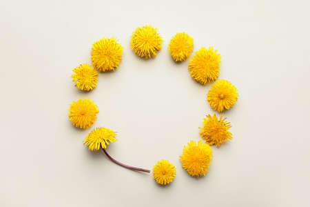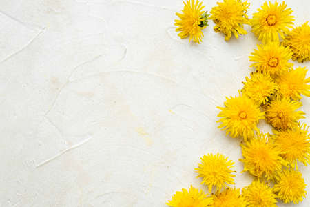 Beautiful vibrant bright yellow background with bright yellow dandelions nature elements. Summer yellow simple background with a frame of flowers for text. Flatlay layout. Copy Space