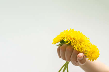 Hand holding yellow wildflowers dandelions on a light background, copy space, postcard. Bright spring wildflowers. Love, romance, wedding concept