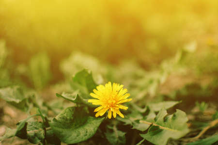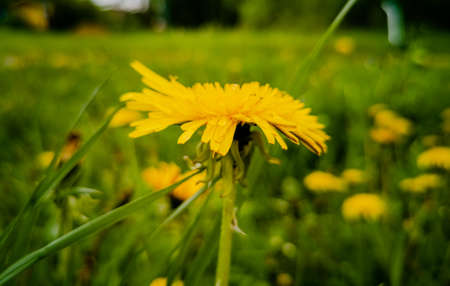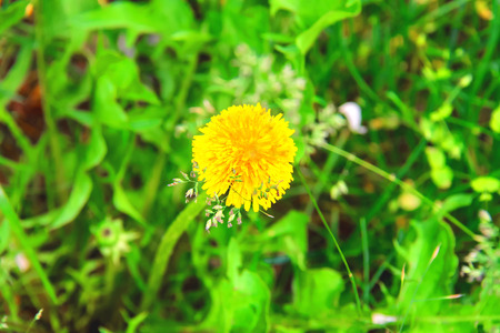 Yellow dandelion in green grass. Spring meadow, selective focus.