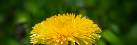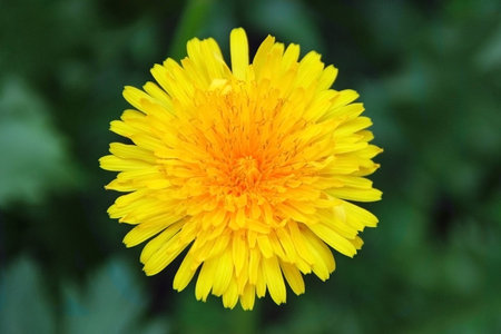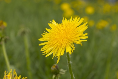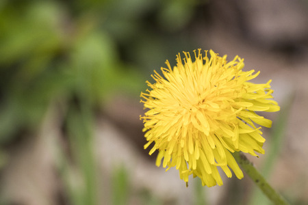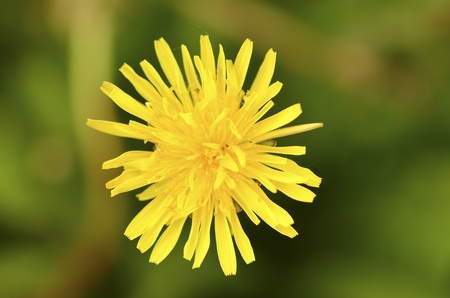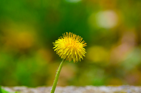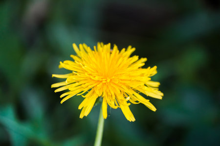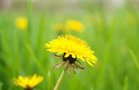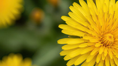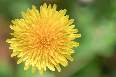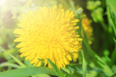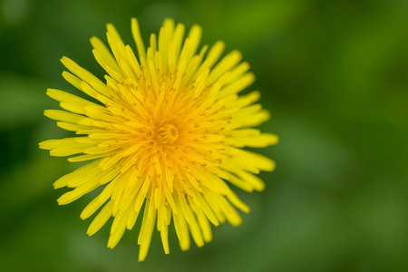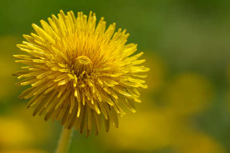 Yellow dandelion or Taraxacum officinale close up view against green natural bokeh background