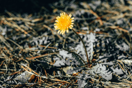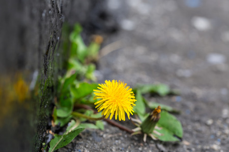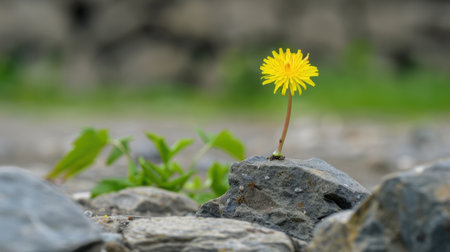 A striking image of a dandelion thriving in a cracked surface, representing nature's resilience in an urban environment. The vibrant yellow blooms attract attention.