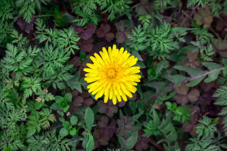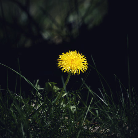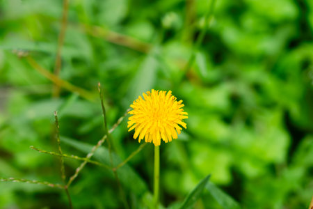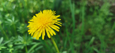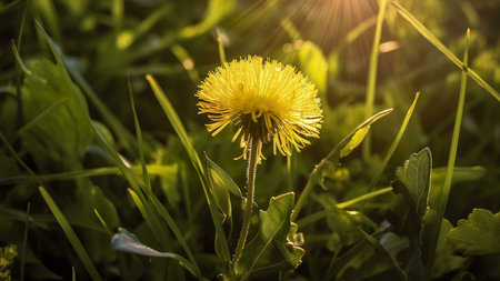Yellow dandelion blooming among the green grass, highlighting its vibrant color in the natural environment