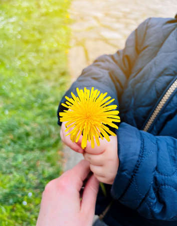Yellow flowers dandelion in children's hands. Spring. selective focus