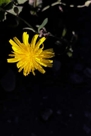 Macro photo of a yellow blooming flower on a dark background during a spring sunny day.