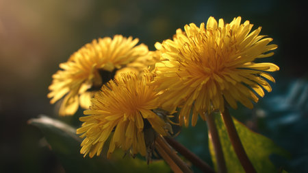 Close-up of bright yellow dandelion flowers illuminated by soft natural light, showcasing their vibrant beauty in a serene garden setting.