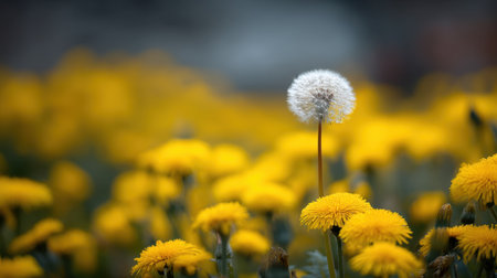 small bright yellow flowers of dandelion with seeds in nature, generative ai