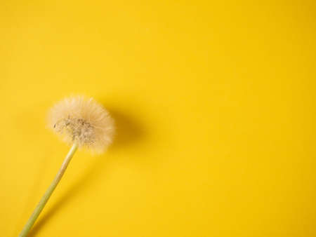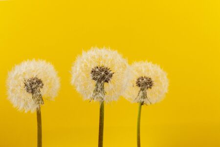 Dandelion flower heads. White dandelions on yellow background. Macro photo.