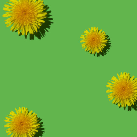 Yellow dandelion flowers on a green background summer and spring creative pattern with a copy space. flat lay