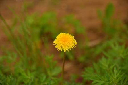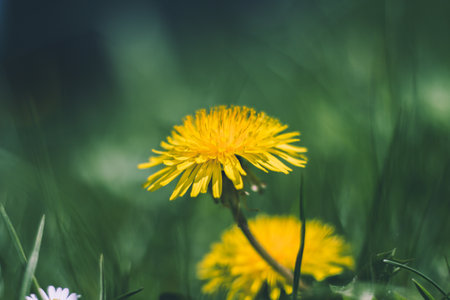 Closeup of beautiful yellow dandelion flower in meadow, selective focus