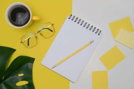 Notebook, coffee cup and clipboard on yellow background.