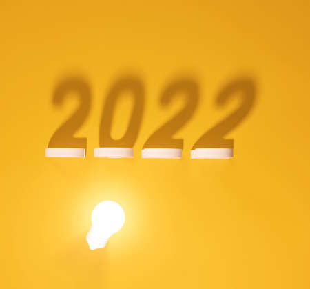 Volumetric metallic silver numbers 2022 on a yellow background. Greeting on the New Year. Top view and copy space.