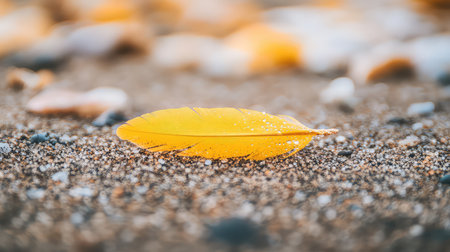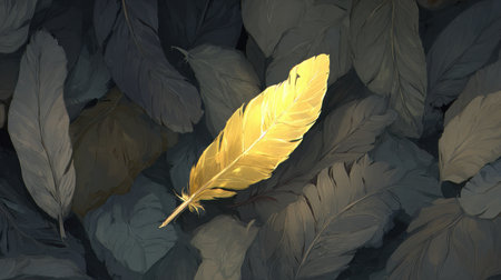 Vibrant golden feather stands out against backdrop of dark, muted leaves, creating striking contrast that evokes feelings of uniqueness and beauty. intricate details of feather highlight its