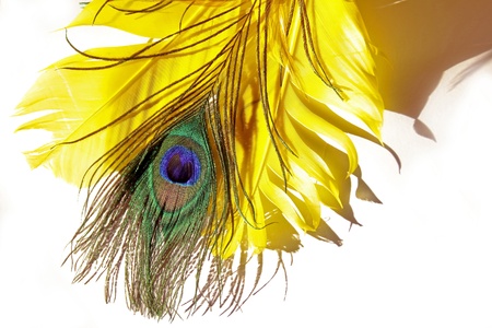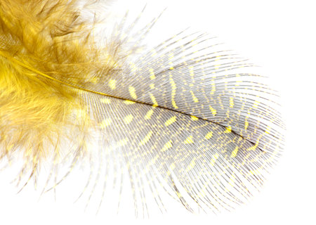 yellow feathers on a white background, close-up, macro photo