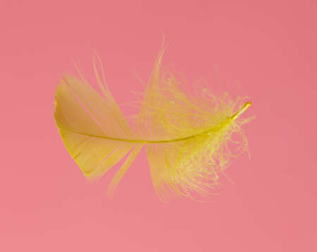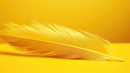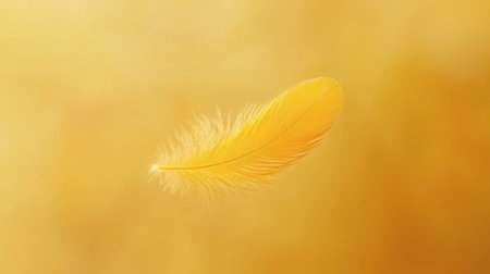 A single yellow feather floating gently against a soft yellow background.