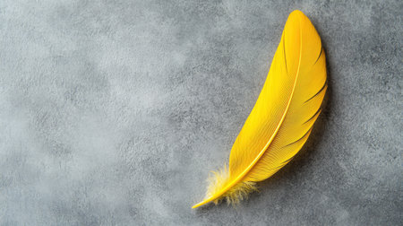 A striking yellow feather rests gracefully on a textured gray background. This image captures the essence of beauty and simplicity, perfect for artistic projects.
