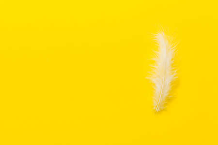 White-blue fluffy bird feather on a yellow background. Top view