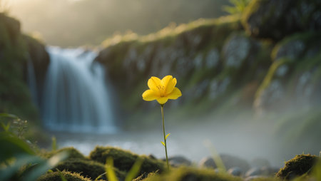AI Generated. Bright yellow flower stands alone in a misty valley with flowing waterfall
