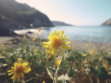 A stunning yellow flower emerges from the rocky terrain of a beach cave, offering a breathtaking view of the serene ocean and sandy shore.