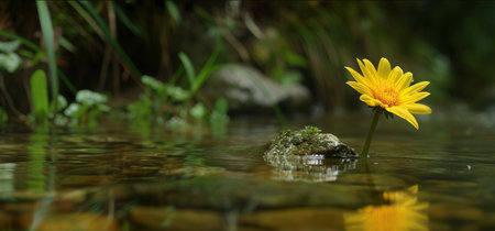 Generative AI Image of Yellow Daisy Flower on Wet Stone with Water Between the Stones