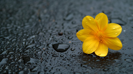 A single, bright yellow flower springs to life against the wet, dark pavement, dotted with raindrops, conveying hope and resilience.