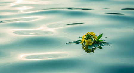 Delicate yellow flowers float gracefully in clear water, surrounded by bubbles that add a vibrant touch to the serene underwater environment, creating a calming and refreshing scene.