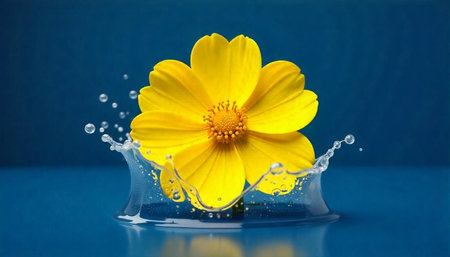 Vibrant yellow flower with water splash on blue background