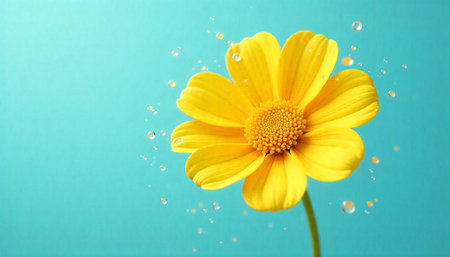 Bright yellow flower with water droplets on turquoise background