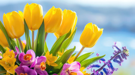 A stunning spring bouquet featuring bright tulips and fragrant hyacinths, set against a serene ocean backdrop. Perfect for celebrating nature's beauty.
