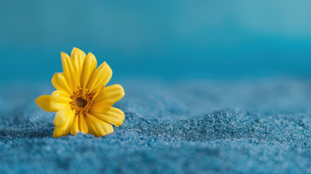 A stunning closeup of a bright yellow flower resting on soft blue sand, capturing the essence of nature's beauty and tranquility. Perfect for various themes.