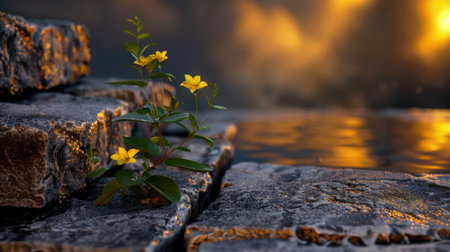 A vibrant yellow wildflower emerges from rugged stone steps beside a shimmering water surface, illuminated by a golden sunset sky, creating a serene nature scene.