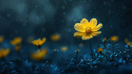 A yellow flower in the middle of a field with rain falling, AI