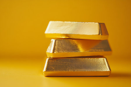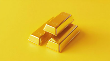 This image features three gold ingots stacked against a vibrant yellow background, representing wealth, luxury, and financial success, ideal for investment themes.
