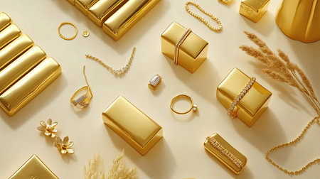 This stunning flat lay features an elegant array of gold jewelry and accessories, showcasing luxury and sophistication on a warm beige background. Perfect for fashion and style content.