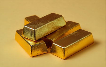 Four shiny gold bars are stacked in an elegant arrangement against a smooth, neutral background, emphasizing their lustrous surface and wealth..