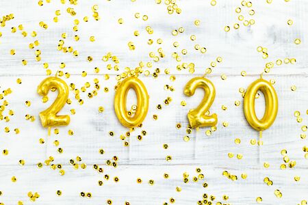 Happy New Year 2020 gold numbers on white wooden background and golden sparkle. Flat lay