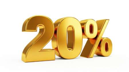 This image features a golden 20% symbol prominently displayed against a white background. The symbol is rendered in a 3D style, giving it a shiny, metallic appearance. The white background provides a stark contrast, making the golden 20% symbol stand out clearly. This image is ideal for use in promotional materials, advertisements, or design projects.