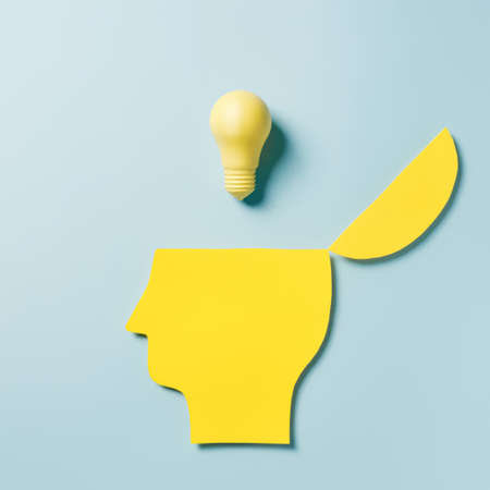 Yellow paper head silhouette with an open mind full of mindful ideas on pastel blue background. Creativity and brainstorming concept. A light bulb as idea for smart ideas. Flat lay, top view.