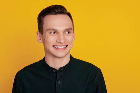 Profile portrait of positive cheerful guy look empty blank space shiny white smile on yellow background