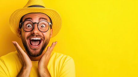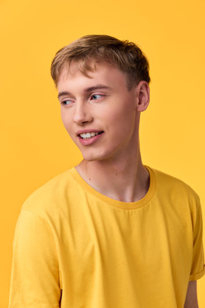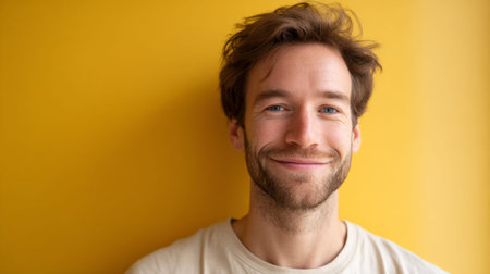 Casual young man with a warm smile wearing a yellow tee against a vibrant yellow studio background natural pose soft lighting ideal for lifestyle and fashion projects