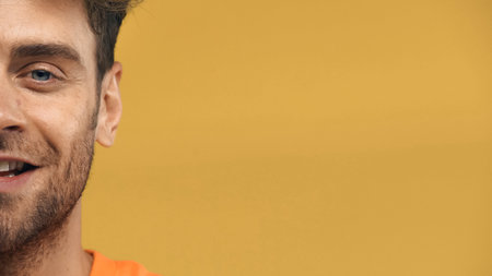Headshot attractive young bearded Caucasian man looking at the camera, smiling, showing teeth isolated selective focus orange background studio shot copy space . High quality photo
