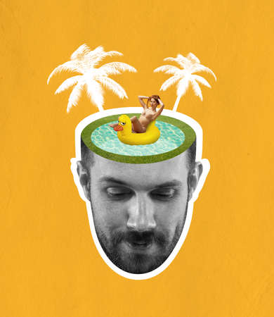 Modern design, contemporary art collage. Inspiration, idea, trendy urban magazine style. Surrealism. Male head like swimming pool
