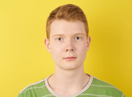 portrait of a cute guy on a blue background in a yellow T-shirt