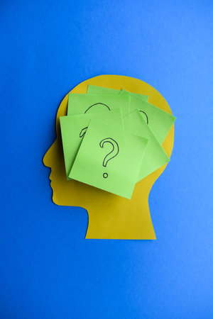 Open your mind, mental health concept, creative thinking. Paper silhouette of human head and brain on yellow background
