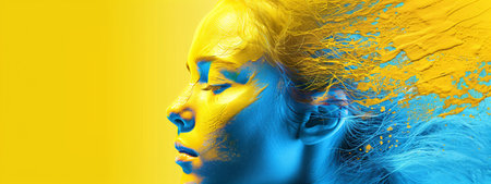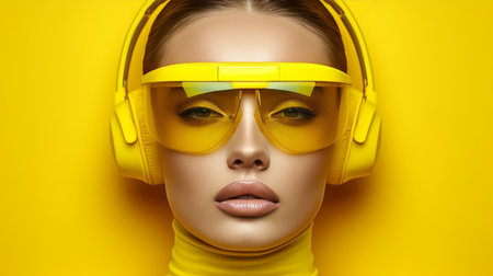 Young woman in headphones in a yellow jacket on a yellow background. Banner